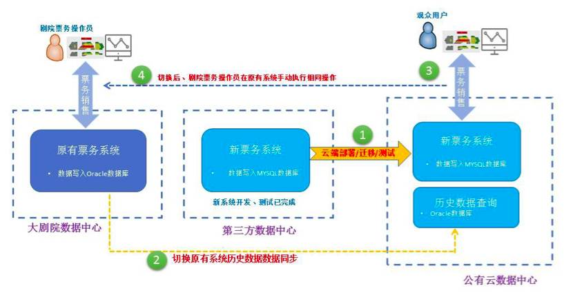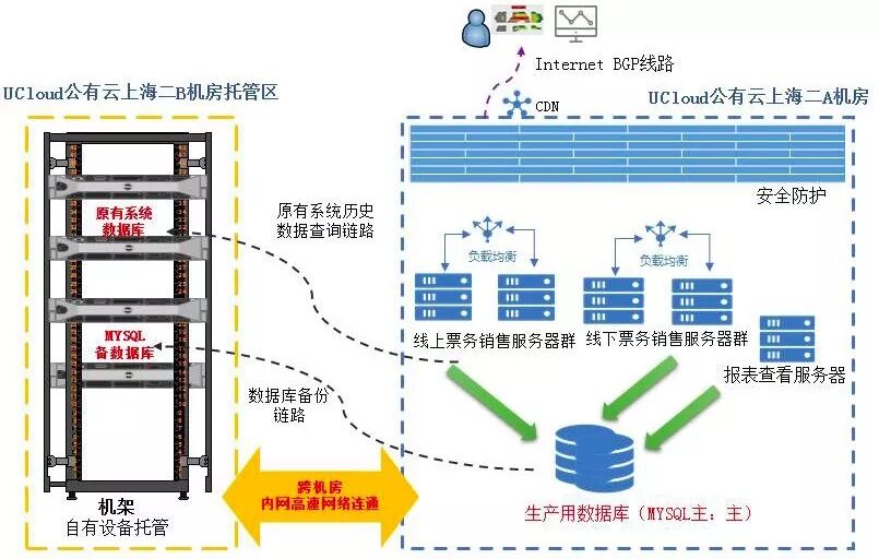 由于原有的系统涵盖功能较多,贸然替换可能会影响日常票务销售工作。UCloud团队经过多次沟通,发现新系统升级存在的客观问题集中于两方面:一是原有系统历史数据同步至托管区的物理服务器,以供新系统进行历史数据查询;二是保障新系统与上海大剧院原有系统的平稳交接,数据可以实现安全转移。因此经过协商,上海大剧院最终采取“双系统并行”方案。