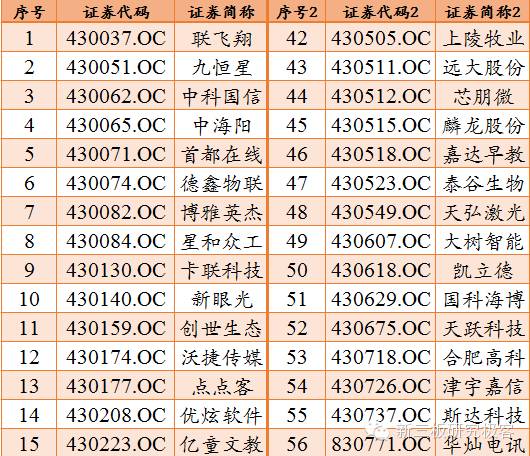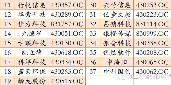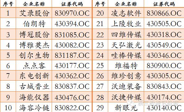 点点客成立于2008年,是一家专注于大中型企业移动应用的高新技术企业,是业内首家倡导“信息2.0”概念的企业。点点客在全国各地开设14家分公司和办事处,并拓展了遍布连锁、金融、零售、汽车、医疗等多个行业的数万家企业客户。东电创新是窄带宽视讯传输技术的开创者与领导者,拥有视讯与数据传输领域的数十项国家级知识产权。公司独有技术"窄带宽视讯传输编码",打破了视频传输领域中"带宽与清晰度对等"的常规认识,填补了该领域的技术空白。古城香业始建于1982年,主要生产和销售中高档空气卫生香、香文化产品、空气熏香、礼佛祭祀用香四大系列2000余种产品。集团实现了从原料生产源头到成品销售一条龙的格局其生产规模、产品质量、技术实力、市场覆盖率等方面在全国制香业乃至亚洲均居首位。海能仪器成立于2006年,致力于食品药品的安全营养与科学分析仪器、分析方法的研究,为科技工作者提供仪器及全面的解决方案。公司已拥有物理光学、微波消解、液相色谱、电化学、元素分析等七十余款产品。海容冷链成立于2006年,专注于商用冷链设备的研发、生产、销售和服务,以商用冷冻展示柜、商用冷藏展示柜为核心产品,为客户在销售终端的食品冷冻、冷藏及展示提供定制化的产品和服务,多项自主技术已具有国际先进和国内领先水平。行悦信息成立于2007年,主营业务为酒店客房数字多媒体系统平台产品的研发、销售和经济型连锁酒店数字多媒体信息的运营业。公司通过专利技术、传媒和广电的融合,创造终端设备商、内容集成商、渠道运营商融为一体的平台式新媒体——悦传媒。华索科技成立于2005年,是一家集自动化领域控制工程开发应用、应用软件开发、系统集成、仪表销售于一体的综合性高科技企业,专注于炭素行业的生产过程自动化控制系统的开发及应用,并掌握了整个炭素生产线的全过程工艺技术与控制方法。佳力科技成立于1996年,是一家跨国经营的国家重点扶持高新技术企业,拥有20万平方米的高新技术研发制造基地。下属佳力风能、佳力防爆车辆、佳力德国等5家境内外子公司,长期专注于石油化工设备,大型风电部件和防爆工业车辆等高科技产业。九恒星成立于2000年,是一家软件产品及互联网信息技术服务的提供商,致力于通过互联网信息技术的应用,帮助企业改善现金流。作为资金管理软件及其互联网增值服务市场的领先者,公司是目前业内与商业银行总行级接口最多的平台供应商。卡联科技创建于2006年,致力于线下电子金融和移动支付平台的研发和智能服务终端的网点网络的建设,全面提供具有自主知识产权的电子金融、移动支付和线下受理服务网点网络运营管理与解决方案,是中国线下便利电子商务的领航者。凯立德是国内的电子地图、导航系统和车载智能终端产品及服务提供商,始终致力于为国内外汽车制造厂商、汽车电子厂商、便携导航设备厂商、手机厂商、电信运营商、互联网及移动互联网企业提供专业化、高品质的地理信息产品和服务。科洋科技成立于1997年,专业从事工业流体计量产品的生产、研发和销售,以及提供化工节能环保专有技术解决方案,业务涵盖工业流体计量、环境工程和涂层科技领域。在产品、服务和国际合作上,公司全方位保持扩张合作态势。蓝天环保成立于2001年,是国内最早专注于合同能源管理、节能服务、节能供热投资、节能技术研发的高新技术企业,承接大型机电设备的安装,成为供暖系统方案的解决者,节能减排方案的响应者,可再生能源的开发者,BOT运营的践行者,合同能源管理的策划者。麟龙股份成立于2002年1月,为互联网金融及证券行业综合服务提供商,采取母子公司分工协作的经营模式,母公司负责所有软件类产品的研发并负责销售不具有荐股功能证券分析软件产品,子公司具有证券投资咨询业务资质,负责销售具有荐股功能的证券分析软件产品。凌志软件成立于2003年,是国家规划布局内重点软件企业,专注于向国际、国内客户提供高端金融IT服务,已成为金融领域IT企业的行业翘楚。近年来,凌志软件国内市场业务不断开拓,产品得到国内外金融行业知名券商的认可,在金融软件市场处于领军地位。宁夏上陵牧业股份有限公司是宁夏百强企业上陵集团旗下大型子公司,始建于2000年,目前下辖翔达牧场、信旺牧场、众牛牧场、牧源牧场、俊佑牧场、元邦牧场6个现代化奶牛养殖场。公司通过对牧场的精细化、标准化管理,所生产的原奶干物质含量均优于国家标准,深受众多在宁奶企青睐,成为蒙牛集团签约的“全球优质奶源供应基地”,成功跻身首届宁夏中小企业50强之列。上海四维文化传媒有限公司成立于2005年,是从事广告综合代理与商业印刷服务的一家综合性广告公司,专业提供DM广告整体解决方案,即一站式服务的公司。连续多年被上海市工商局评为“重合同、守信用单位”,被上海市广告协会、杨浦区广告协会评为“重信誉、创优质服务先进单位”。苏州天弘激光股份有限公司成立于2001年。目前产品主要涉及有激光打标机、数控激光切割机、激光焊接机、精细激光微加工及激光熔覆等五大系列。公司以激光事业为主旨,期待与国际先进技术接轨,打造出世界级的产品和服务品牌,创造国际领先的激光应用设备。哇棒传媒成立于2009年,是一家拥有三