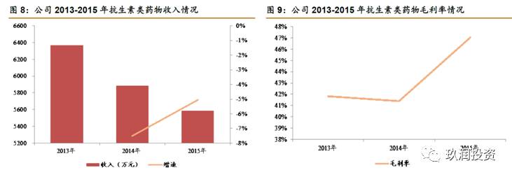 公司的营收在稳定的增长,抗生素业务的营收逐年下滑,但仍占营收的四分之一,利尿剂业务营收有所抬升13-16年抗生素占比营收37.56%、30.22%、25.56%、25.42%。利尿剂13-16年营收占比24.54%、29.44%、29.66%、29.43%