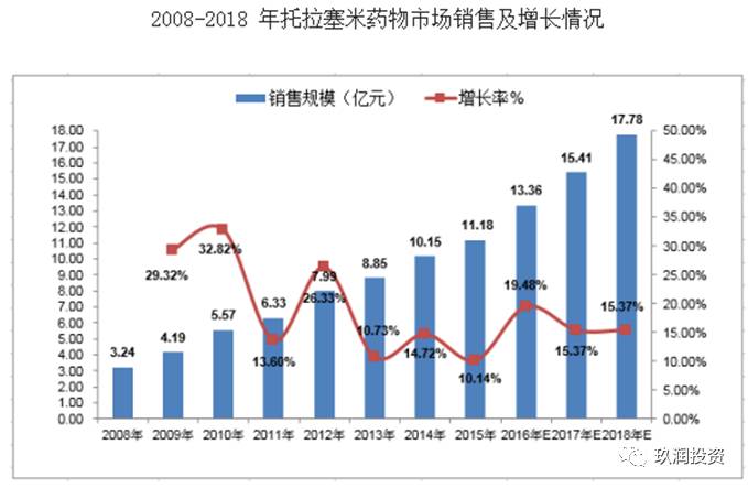 根据 CFDA 南方所的数据,托拉塞米在利尿剂市场中的份额从 2010 年的 66.13%上升至 2015 年的76.45%,上升趋势明显,与其他品种的优势继续拉大,成为利尿剂药物中的领导品种。托拉塞米近年来的市场表现向好, 2008-2015 年销售额由 3.24 亿元增加至 11.18 亿元,市场复合增长率为 19.35%。根据 CFDA 南方所的预测,到 2018 年托拉塞米药物整体市场规模将突破 17 亿元。