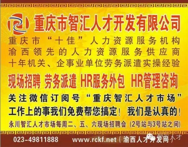1.保洁:3名,女,48岁以下,为人诚恳,吃苦耐劳,待遇:1700元/月+五险,每天上班8小时,月休4天,工作地址:永川新城建管委。