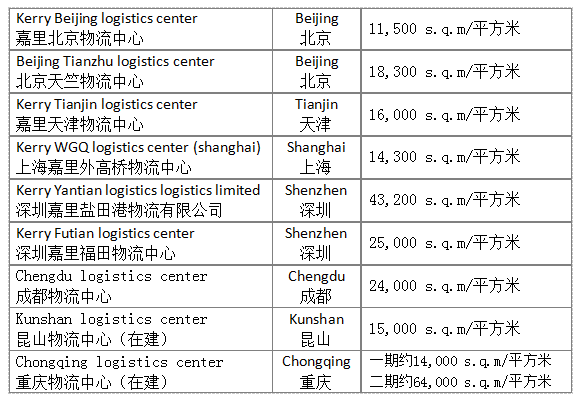 嘉里大通物流在中国大陆拥有9个(其中二个正在建设中)世界级物流中心,经营逾450,000平方米的多功能仓库(含外租仓库),于北京、上海、重庆、广州、深圳、厦门、大连、武汉、成都、江苏 青岛 乌鲁木齐 天津 济南 烟台拥有大型物流分拨中心。
