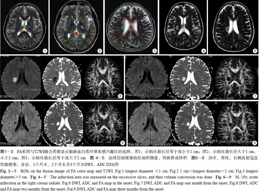 将所得扩散张量原始图像传入Philips View Forum (ExtendedMR Work Space 2.6.3.1)后处理工作站,由1名已从事磁共振神经系统影像诊断12年的医师使用Fiber Tracking软件进行统一标准的图像后处理。计算部分各向异性指数(fractionalanisotropy,FA)和表观扩散系数(apparent diffusion coefficient,ADC)。感兴趣区选取标准:根据DWI及T2WI图像上每个层面病灶的大小取感兴趣区:病灶最长径等于或小于1 cm的取1个感兴趣区,最长径在1~2 cm之间的取2个感兴趣区,最长径等于或大于2 cm的取3个感兴趣区(图1~3);同时在对侧镜像脑白质取对照区。感兴趣区及对照区的大小均为一个像素值。根据每个层面病灶感兴趣区和对照区获得FA值和ADC值分别计算FA比值(rFA)和ADC比值(rADC),并取平均值。计算梗塞体积:于PACS(东软,中国)上先参考DWI图像,再于T2WI序列梗塞病灶每个层面上沿病灶边缘手工划取得到面积(图4~5),乘以6 mm [层厚(5 mm)加层间距(1 mm)],得到每层的体积,最后病灶各层面体积值相加得到总体积。