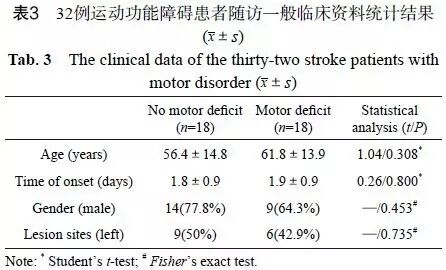 1年后随访到的32例运动功能障碍患者,梗塞累及多处脑白质8例,放射冠17例,内囊后肢2例,胼胝体1例,脑干皮质脊髓束3例,外囊1例。患者一般临床资料见表3。
