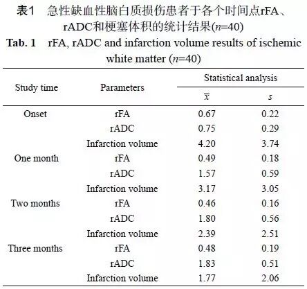 首诊40例急性缺血性脑白质损伤并有运动功能障碍患者[左侧18例,右侧22例;首诊MI范围1~96.5分,x±s:(70.3±28.6)分]中,梗塞累及多处脑白质8例,放射冠17例,内囊5例,胼胝体1例,上纵束2例,脑干皮质脊髓束4例,大脑脚、外囊和丘脑辐射各1例。首诊急性期梗塞灶DWI为高信号,FA及ADC为低信号;1个月末梗塞灶DWI为低或稍高、低混杂信号,FA为低信号,ADC为高或高、稍低混杂信号;2个月末和3个月末梗塞灶DWI及FA为低信号,ADC为高信号,病灶范围随时间推移而逐渐减小(图6~9)。40例患者于各个时间点rFA(FA值病灶/镜像侧)、rADC(ADC值病灶/镜像侧)和梗塞体积的统计结果见表1。