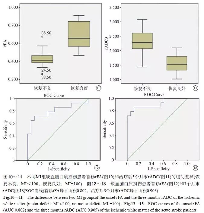 32名患者1年后MI范围为:24.5~100分,x±s:(88.5±18.0)分;低于100分的梗塞累及部位为多处累及7例,累及放射冠4例,脑干1例,内囊后肢1例。多元线性回归分析显示急性缺血性脑白质损伤恢复良好患者首诊rFA和3个月末rADC与MI有显著相关性(t=2.95,P=0.00和t=2.75,P=0.01)。缺血脑白质纤维束损伤患者不同MI组首诊rFA和治疗后3个月末rADC之间差异见图10~11。图12~13为ROC曲线分析显示首诊rFA峰下面积0.802,治疗后3个月末rADC峰下面积0.905,后者判断准确率更高。