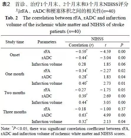 重复因素方差分析显示rFA和rADC于首诊、1个月末、2个月末、3个月末各时间点具显著统计学差异(F=13.84,P=0.00和F=64.57,P=0.00)。LSD-t检验显示首诊分别与1个月末、2个月末、3个月末的rFA均显著不同(P=0.00),首诊最高;首诊分别与1个月末、2个月末、3个月末的rADC以及1个月末与2个月末、3个月末的rADC显著不同(P=0.00),首诊最低,后逐渐增高。梗塞体积于首诊、1个月末、2个月末、3个月末各时间点具显著统计学差异(F=37.41,P=0.00)。首诊分别与2个月末、3个月末的梗塞体积以及1个月末与3个月末的梗塞体积显著不同(P=0.00),首诊最大,后逐渐减小。首诊和1个月末rFA与NIHSS评分显著负相关(r=-0.59,t=-4.59,P=0.00和r=-0.34,t=-2.27,P=0.02),rFA越低,NIHSS评分越高;首诊rADC与NIHSS评分显著负相关(r=-0.44,t=-3.04,P=0.00),1个月末、2个月末、3个月末rADC与NIHSS评分显著正相关(r=0.28,t=1.83,P=0.04;r=0.39,t=2.69,P=0.00;r=0.63,t=4.99,P=0.00);梗塞体积于1个月末、2个月末、3个月末与NIHSS评分显著正相关(r=0.40,t=2.73,P=0.01;r=0.44,t=3.05,P=0.00;r=0.32, t=2.13,P=0.04),梗塞体积越大,NIHSS分值越高,见表2。
