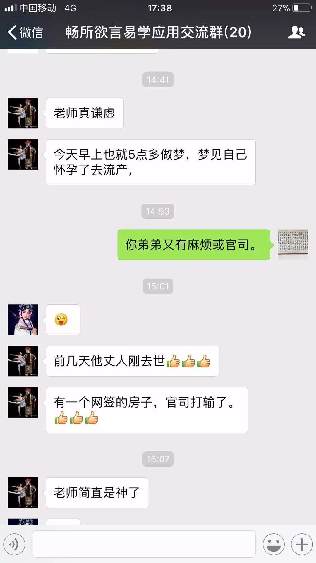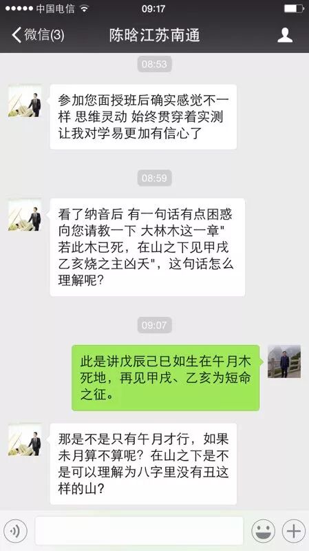 学员梁青同样用干支易象知识在网上断奇门局对方因为两笔来源不清的钱打官司,有头部疾病高血压等等信息都断准了。河北的冉学明用干支易象解梦也都非常准确。学员们分享各自的易案,让老师和学员都为之振奋,说明贺云飞干支易象学是能够学得会,而且是能运用到各门术数上的。许多参加贺云飞干支易象面授讲座的学员谈到学习的收获和感受时都说贺老师的干支易象“颠覆三观”,超越了过去学易的思维模式,准确性的提高也增强了学易的信心。