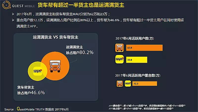 货主端APP的情况也是如此,在QuestMobile的另一份报告里,2016年6月-2017年6月,运满满货主端APP用户规模从10万左右增长至62万,进入2017年后的半年里增长尤为迅速。而货车帮同期的货主端APP用户规模始终落后运满满。除去两者重合的12.3万用户,运满满独占货主端用户比例达80%。