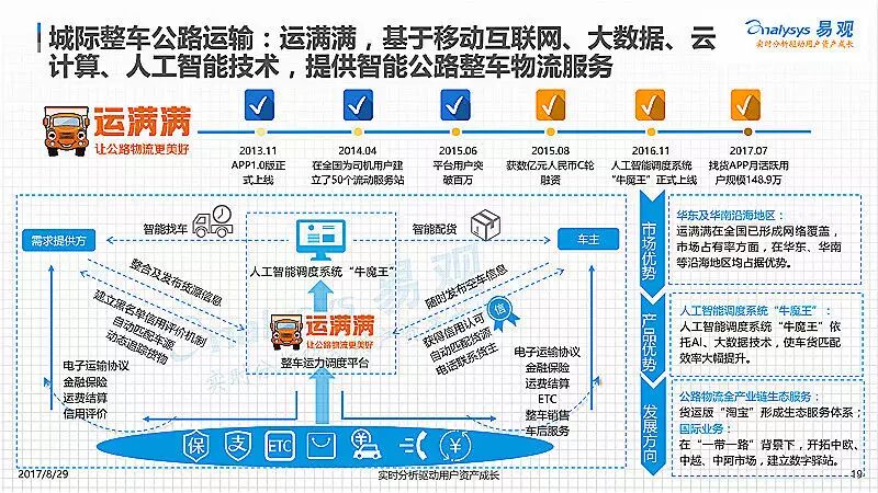 目前运满满已经借助“”政策东风开始做“物流国际化”布局。比如他们与中欧班列、中阿班列、国际空运等运输方式合作,探索基于物流云的多式联运;与银川、中国-东盟信息港达成深度战略,并开发多语种的国际版APP;沿“”交通走廊关键枢纽设立“数字化驿站”为司机提供服务。