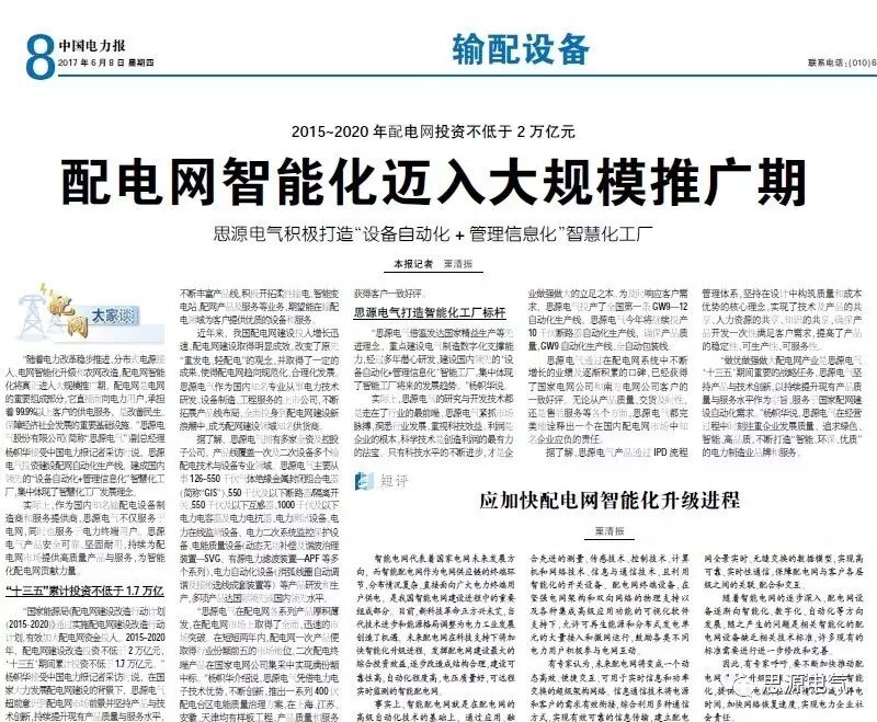 “国家能源局《配电网建设改造行动计划(2015~2020)》通过实施配电网建设改造行动计划,有效加大配电网资金投入。2015~2020年,配电网建设改造投资不低于2万亿元,‘十三五’期间累计投资不低于1.7万亿元。”杨帜华接受中国电力报记者采访时说,在国家大力发展配电网建设的背景下,思源电气超前意识到配电网市场前景并坚持产品与技术创新,持续提升现有产品质量与服务水平,不断丰富产品线,积极开拓柔性输电、智能变电站、配网产品及服务等业务,期望能在输配电领域为客户提供优质的设备和服务。