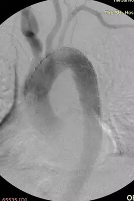 充分的术前评估及准备,确保了手术的顺利进行。术中王兵教授亲自主刀,崔文军副主任及王颖、司江涛主治医师作为助手,经股动脉小切口,先于左侧锁骨下动脉狭窄处准确定位后置入球扩支架1枚,再次造影明确溃疡位置后,将主动脉带膜支架顺利输送到位,并成功释放,完全覆盖病变主动脉,复查造影效果满意(图3)。术后患者即清醒,安全返回病房,测量双上肢血压无差别,双下肢温度、颜色正常,感觉及运动均无异常,即挽救了患者生命,也成功避免了截瘫的发生,大家悬着的心都放了下来。术后施敏护士长带领的护理团队,娴熟而全面的护理确保患者平稳度过围手术期,术后10天复查CTA:左侧锁骨下动脉及主动脉支架均位置良好,形态满意。目前李大娘已顺利康复出院。