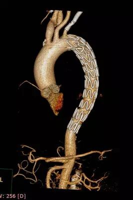 大娘虽刚年过六旬,但高血压、糖尿病、高脂血症等“富贵病”一个不少,在六年前就因“冠心病”置入了2枚支架,术后管住了自己的嘴,也迈开自己的腿,更是按要求定期复查心脏CTA检查,但1个月前在海南旅游时因出现心前区不适。再次复查CT,冠脉支架仍通畅良好,但却在无意中发现主动脉内壁出现小的破口,持续高压的血流冲击已使局部管壁变薄,并向外膨隆,更为严重的是血流已沿着破口向远端撕裂,形成局限性动脉夹层,随时存在主动脉破裂出血,导致死亡风险,病情危急。家住南阳的李大娘一家,经过打听,了解到郑州大学五附院副院长、血管外科专家王兵教授在血管疾病的诊疗上独树一帜,技术高超,不敢耽搁,直接从海南飞至郑州。办理住院手续后,王兵教授第一时间查看病人,告诉患者现在这样的疾病通过微创手术就可以得到治愈,极大缓解患者及家属的紧张情绪。