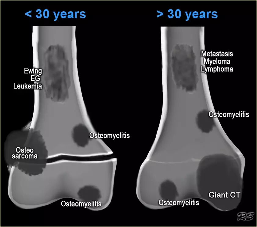 以上表格是最常见的骨肿瘤和肿瘤样病变在不同年龄组。在中间列中常见的边界不清的溶骨性病变。