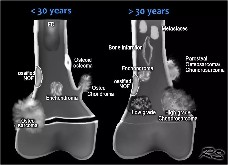 骨肉瘤。骨肉瘤是第二常见的原发性骨癌。它每年发生在百万分之二到五个人,大多数情况下在青少年和儿童。大多数肿瘤在膝盖周围在股骨(大腿)或胫骨(胫骨)中发展。其他常见的位置包括臀部和肩膀。骨肉瘤通常用化疗和手术治疗。