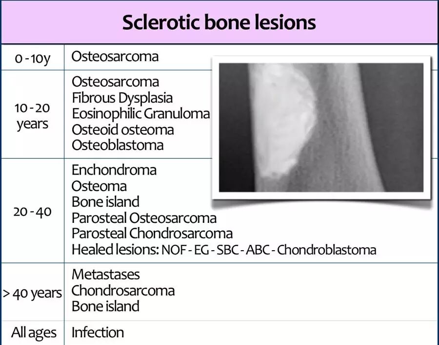 注意,在年轻的年龄组中经常出现的许多良性溶骨性病变可能愈合,并且在中年组中表现为硬化病变。