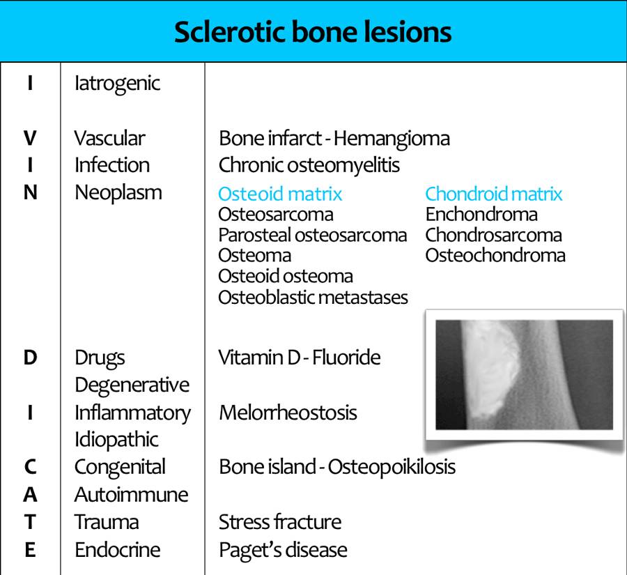 纤维性发育不良和嗜酸性肉芽肿更常作为溶骨性病变存在,但它们可以是硬化性的。