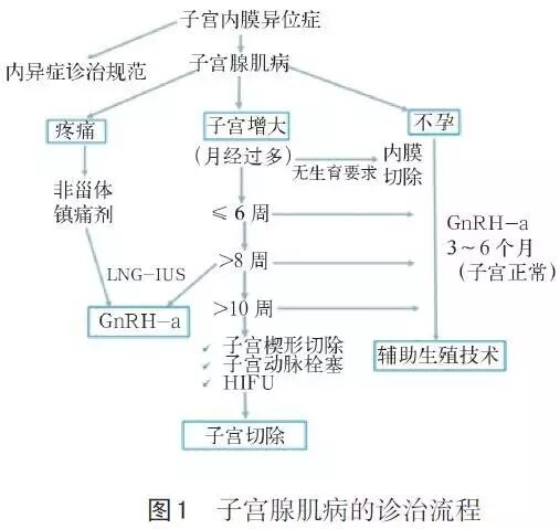根据内异症的3大主要问题,即盆腔包块、痛经和不孕,我们制定了内异症的诊治流程并进行了多次修订,对腺肌病也特别制定了诊治流程(如图1)。