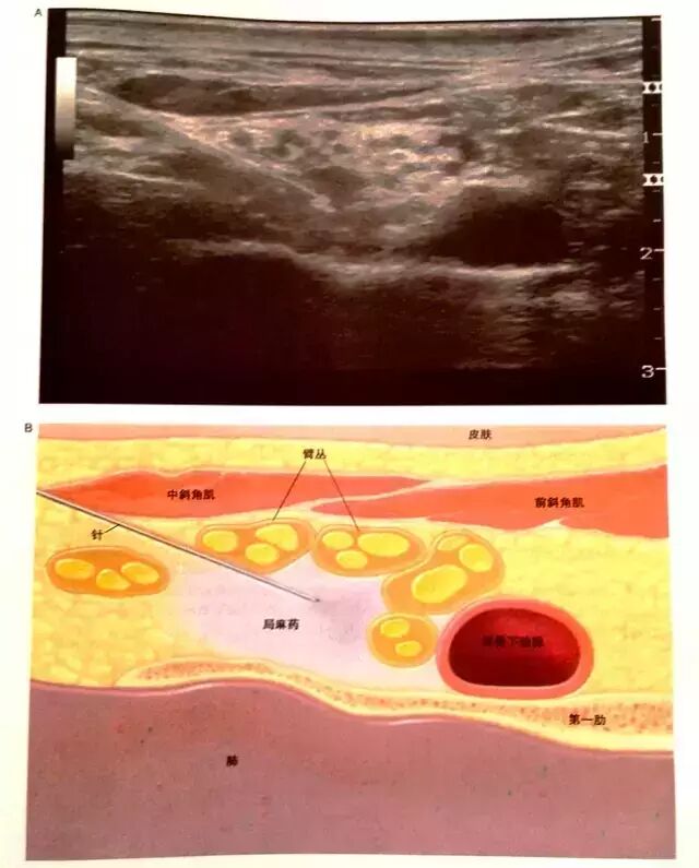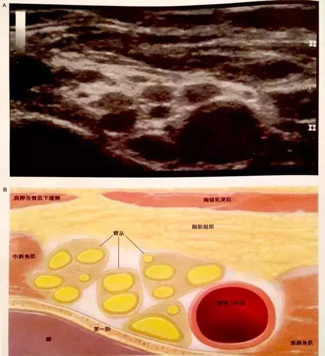 传统锁骨上入路臂丛神经阻滞常有会发生气胸的风险,准确性也较差,因此有时需反复多次穿刺。而超声引导下锁骨上入路法是被用来实施臂丛神经阻滞的一种新方法,此方法可在直视下清晰地分辨神经及周围组织的结构,引导穿刺针到达靶神经,并观察局麻药的扩散规律,从而减少局麻药的用量,提高神经阻滞的成功率,并最大限度的减少并发症的发生。