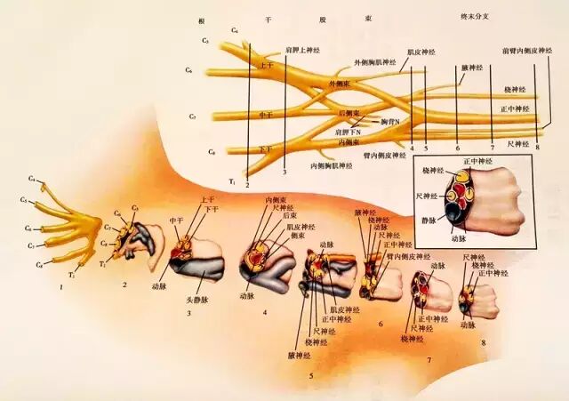 ③支配肘部的终末神经包括桡神经、肌皮神经、臂内侧皮神经和前臂内侧皮神经都从此部位通过,可获得完善的阻滞效果。