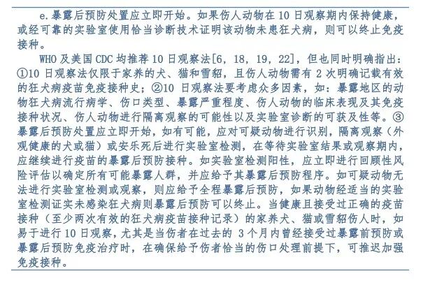 2013 年 WHO 更新的《狂犬病专家磋商会(第二版报告)》中建议: 对于曾接受过全程暴露前或暴露后预防接种者,在接种完成 3 个月内发生暴露或再暴露,如致伤动物健康且已被免疫,并能进行 10 日观察,则在确保给予正确伤口处理的前提下,可推迟加强免疫。
