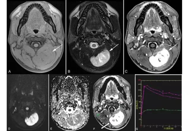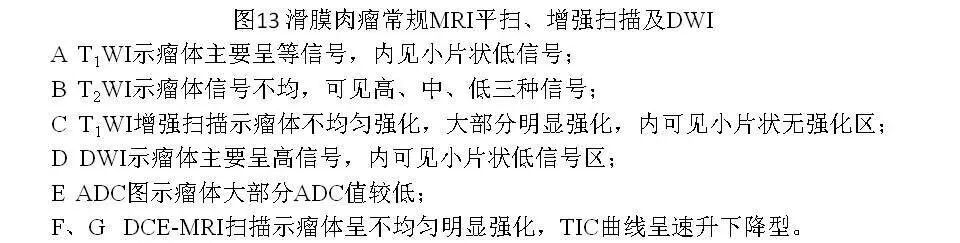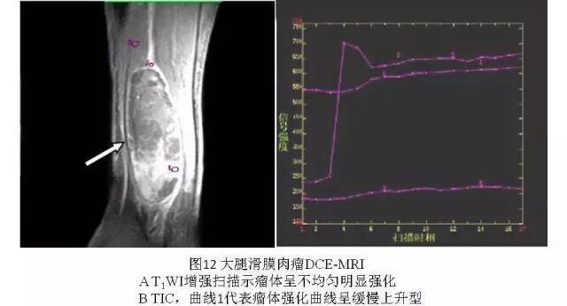 磁共振功能成像技术在滑膜肉瘤的应用价值也较大。DCE-MRI上肿瘤实质部分TIC可为缓慢上升型(图12)或速升下降型(图13)。DWI上肿瘤实质部分可呈高信号,相应ADC值较低,内见斑片状DWI低信号区,相应ADC值较高(图13)。