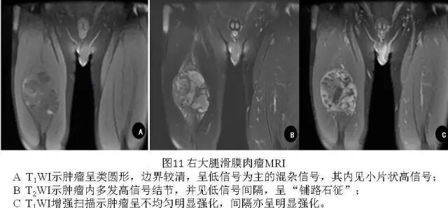 肿瘤在MRI上平扫表现为类圆形或分叶状肿块,T1WI信号多与肌肉相似,肿瘤合并出血时可出现小斑片状高信号区。少数因瘤内广泛的出血,整个肿瘤可呈高信号。T2WI上信号多不均匀,肿瘤内常出现高、等、低三种信号混合存在的征象,有学者称之“三信号征”(也有学者称之“三重信号征”或“三联征”)(图9、图10),是滑膜肉瘤MRI较为特征性征象之一。T2WI抑脂序列上滑膜肉瘤可呈多个大小近似的卵石状结节,其间存在低信号间隔,似铺路石状,称之为“铺路石征”(也有学者称之“卵石征”)(图11),也是滑膜肉瘤MRI较为特征性征象之一。部分病例(15%~25%)可出现液-液平面,为非特异性表现。常规MR增强扫描,肿瘤呈片絮状明显不均匀强化,分隔可呈明显强化(图11)。