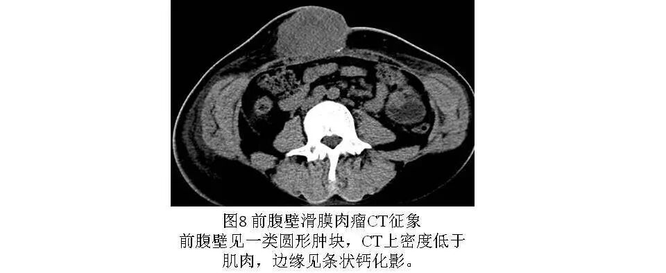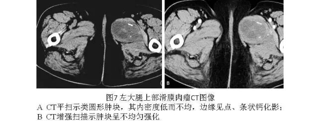 可较清楚显示肿块的大小、范围与周围组织的关系以及X线片难以显示的钙化。CT平扫呈圆形或分叶状肿块,边界清楚,密度多低于肌肉且多不均匀,内见更低密度的液化、坏死及高密度出血区;约20%~40%的滑膜肉瘤可见钙化,钙化常位于病灶的周边,称为边缘性钙化(图7、图8),是滑膜肉瘤CT特征性表现。CT增强扫描肿瘤多呈不均匀强化(图7)或呈渐进性强化,少数肿瘤周围可见异常增粗的血管。