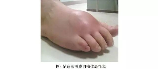 起病比较隐匿,临床症状包括局部隐疼、软组织渐进性肿胀,常伴压痛,病程数月至数年,易误诊为良性病变。也可因一些易混淆的临床症状(无明显肿块的疼痛、关节挛缩)及影像表现(炎性改变、囊变、血肿征象)或创伤病史等而致误诊。如肿瘤增长迅速,可出现局部皮温升高、皮肤静脉曲张、皮肤溃烂、继发感染(图4)。查体多表现为深部软组织肿块,邻近关节功能障碍。