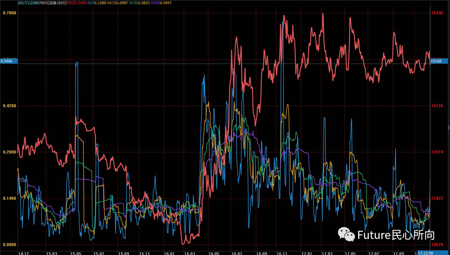 郑棉主力合约波动率HV(5)、HV(15)、HV(30)、HV(50)在10、11月期间处于低值区间波动,进入11月下旬后波动率相继变大,郑棉期价也随之开启上涨和极速下跌回调的走势,在波动率活跃的基础上,盘面行情会继续演绎相应的活力。国内长绒棉价格连续上涨不回头,此类小众资源价值不断放大,采购销售较为理想;进口棉到港价格S\M\L稳中有升,配合且支撑ICE期棉价格上涨。国内郑棉仓单数量自11月开始持续增大,截止12月8日已达2537张(含有效预报)约10万吨现货资源,约占1月合约单边持仓量的66%,部分上游加工企业和贸易商参与1月交割意愿较强。今日郑棉主力合约减仓3.1万手,但整体持仓量环比增大,期货价格开盘后高开低走,减仓下行。12月12日美国农业部(USDA)将公布12月度平衡表,资金减仓撤离存在避险迹象,郑棉15500元/吨位置符合产业资源对近期市场价格高点的初判。