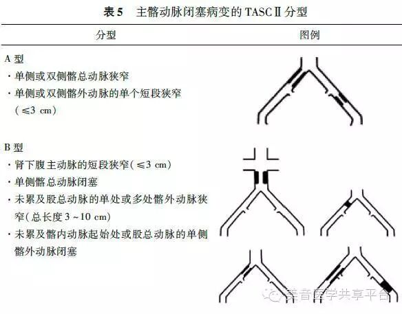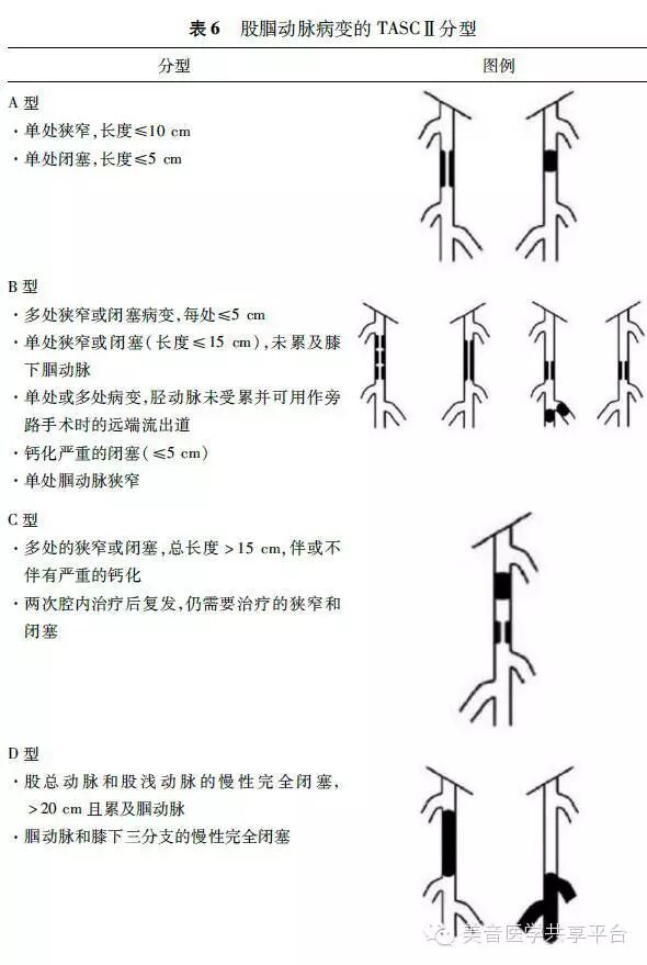 2.分级:根据影像学检查所见动脉狭窄或闭塞程度,可按2007年第2版泛大西洋协作组(TASC)分型标准对主髂动脉病变和股腘动脉病变进行分型(表5,6),对临床治疗及预后具有指导意义。