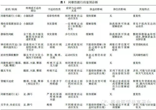 除下肢动脉硬化闭塞症外,主动脉缩窄、动脉纤维肌发育不良、腘动脉瘤、腘动脉窘迫综合征、多发性大动脉炎、血栓闭塞性脉管炎等多种非动脉粥样硬化性血管病变,均可引起下肢间歇性跛行。此外多种神经源性疾病、肌肉关节性疾病和静脉疾病也可能产生小腿疼痛症状,因此间歇性跛行的病因需要鉴别诊断(表1)。