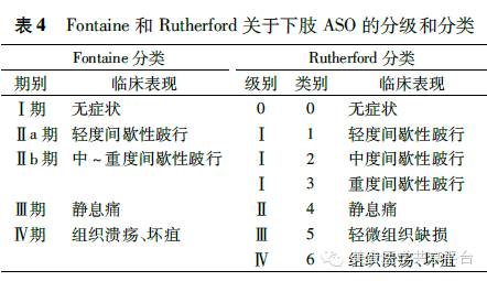 1.分期:下肢ASO的严重程度可根据Fontaine分期和Rutherford分类法(表4)。
