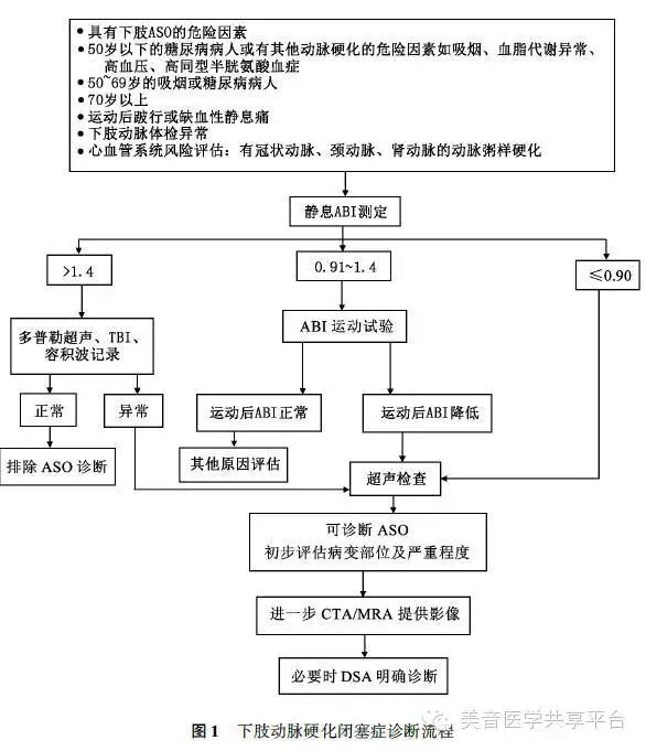 在首次诊断下肢ASO时,应常规进行适当的实验室检查,以发现是否存在可以治疗的高危因素(糖尿病、高脂血症等)和相关动脉硬化所致的器官损害(肾功能)。