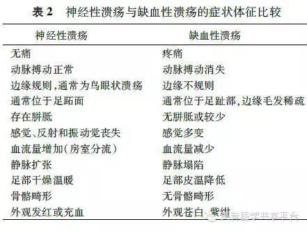 除动脉供血不足外,足部溃疡还可能由其他多种病因引起。常见的有静脉性溃疡,多发生于下肢内踝上方(足靴区)。这种静脉血流淤滞所引起的溃疡,典型表现是溃疡周围湿疹和皮肤色素沉着。周围神经病变也可导致下肢溃疡的形成。由于代谢性疾病(如糖尿病)、肾功能衰竭、创伤或手术等因素导致外周神经受损,患肢保护性感觉丧失,局部压力负荷过大,在反复受到机械压力的部位可发生溃疡。神经性溃疡通常位于身体承重部位,有鸟眼状外观和较厚的胼胝。溃疡周围皮肤感觉丧失,无痛感,触诊足部温暖,肢体远端动脉搏动存在(表2)。