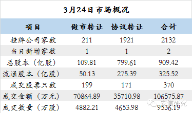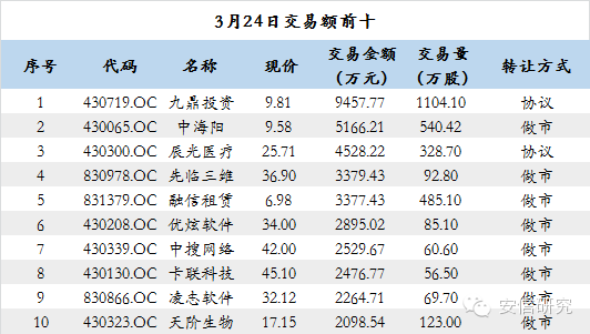 3月24日(周二),新三板共有370只股票出现成交,共成交9536.19万股,106575.87万元。全日涨幅最大的为联宇技术,具体涨幅为1800.00%;全日跌幅最大的为博安通,具体跌幅为96.13%。协议转让股九鼎投资的成交额领跑新三板,具体成交额为9457.77万元,另有10只股票的成交额也均突破了2000万元。