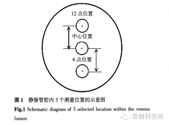 静脉CT值测量:将测量标记R01分别置于选定测量层面血管腔内的3个位置进行测量,包括中心点位置及垂直方向上腹侧(12点方向)和背侧(6点方向)距中心点等距位置的CT值(图1)。