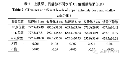 由表2中数据得出,肱骨内外髁连线5 cm处各测量位置中静脉管腔内cT值的差异无统计学意义(肱静脉管腔:F=0.004,P>0.05;头静脉管腔:F=0.102,P>0.05)。肱骨内外髁连线8 cm处各测量位置中静脉管腔内CT值的差异无统计学意义(肱静脉管腔:F=0.007,P>0.05;头静脉管腔:肚2.27 1,P>0.05 o锁骨下静脉层面各测量点之间的CT值差异无统计学意义(F--0.001,P>0.05)。统计结果提示顺静脉血管方向不同位置静脉管腔内对比剂充盈均匀。