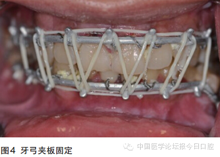 牙弓夹板(图4)由于存在暴露于口腔内的带钩和大量钢丝,所以不利于口腔清洗,容易引起菌斑的持续积聚,炎症细胞浸润,从而造成牙周结缔组织破坏和牙槽骨丧失。牵引钉进行颌间结扎(图5)不需要过多的钢丝,清洁较为方便,有利于患者维护口腔卫生,病人的菌斑指数、牙龈指数增高幅度远低于牙弓夹板病例,也未对口腔内环境产生长远的影响,病人术后的口腔卫生保持也较为容易。