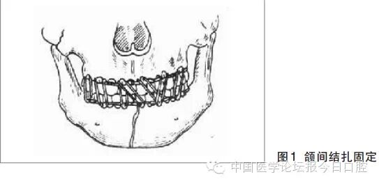 临床上的颌间结扎是借助钢丝和牙弓夹板等装置,依据咬合关系,将上下颌牙弓结扎在一起。对于未移位的骨折可采取直接固定的方法;若骨折发生移位,可借助橡皮圈等装置逐步牵引骨折断端复位,再通过结扎丝给予固定(图1)。