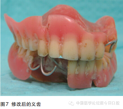 单纯上颌骨折、单纯下颌骨折、上下颌骨联合骨折、牙槽骨骨折、髁突骨折,单发骨折、多发骨折,新鲜骨折、陈旧性骨折等均可采用,尤其是对于无牙颌总义齿和缺牙较多的局部义齿患者,可借助原有义齿进行牵引固定,取得较好的效果(图6~8)。
