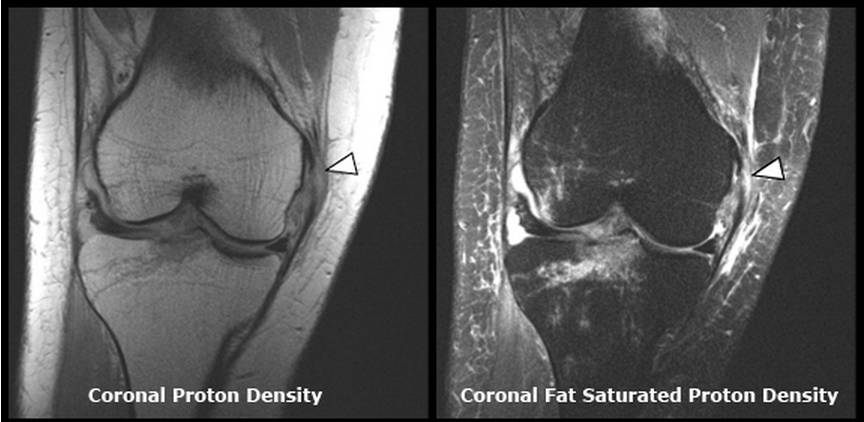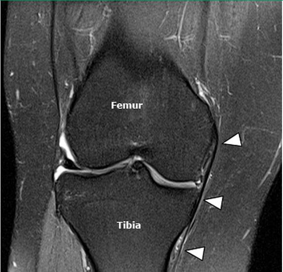 图6,内侧副韧带I级损伤。肉眼观内侧副韧带完整,但仍可见高亮信号覆盖(箭头区域),此为撕裂的韧带纤维所导致的水肿。I级损伤中,水肿只在浅层可见,内侧副韧带粗细正常,紧贴骨皮质。