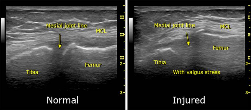 一些观察性研究及个案报道认为床旁超声可很好地评估内侧副韧带撕裂,他们根据超声的异常表现及关节间隙打开程度的量化评估确定内侧副韧带的病变区域(图9)。不过关于超声对于内侧副韧带损伤的诊断意义仍需要大量的高证据等级的研究进行论证。