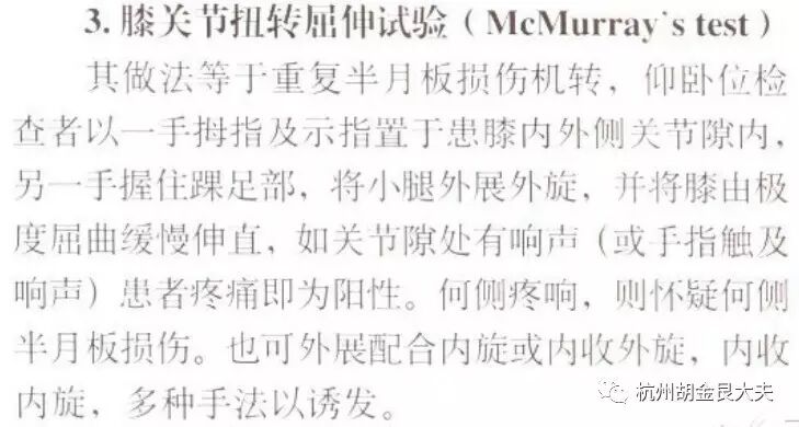 “半月板挤压试验:由McMurray首先创立,现在有很多改变。患者仰卧位,膝完全屈曲,检查者一手按膝关节同时手指置于关节间隙,另一手握住足使膝关节在内收或外展以及内旋或外旋应力下被动缓慢伸直,出现疼痛和弹响为阳性。按检查者对膝关节施加的应力,该试验共在四种方式下进行,即内收内旋内收外旋,外展外旋和外展内旋。依据发生疼痛和弹响的关节角度和施加的应力方式分析判断半月板损伤的部位。半月板损伤时该试验仅30%阳性。