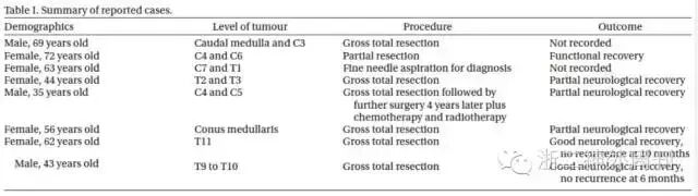 图5. 目前已报道的8例髓内黑色素性神经鞘瘤总结。