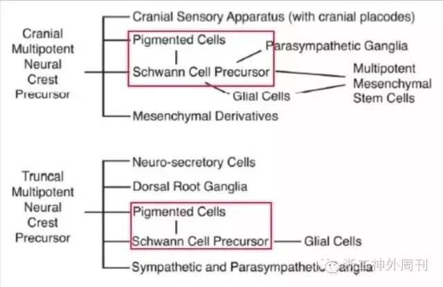 从胚胎发生学上来说,黑色素生成细胞和雪旺细胞均由多型性神经嵴前体细胞分化而来,且互相之间有联系(图6)。目前MS的形成机制有两种假说,一是神经嵴细胞在分化为雪旺细胞过程中夹杂了生黑色素细胞的成分;另一解释是成熟雪旺细胞发生了生黑色素性转化[4] 。