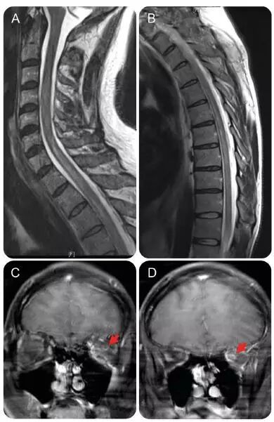 图 1 患者颈胸段脊髓核磁表现。颈段(A)和胸段(B)MRI 显示 C6-C9 节段脊髓信号异常;头颅 MRI 增强 T1 像(C,D)显示左侧视神经强化信号(箭头所示)