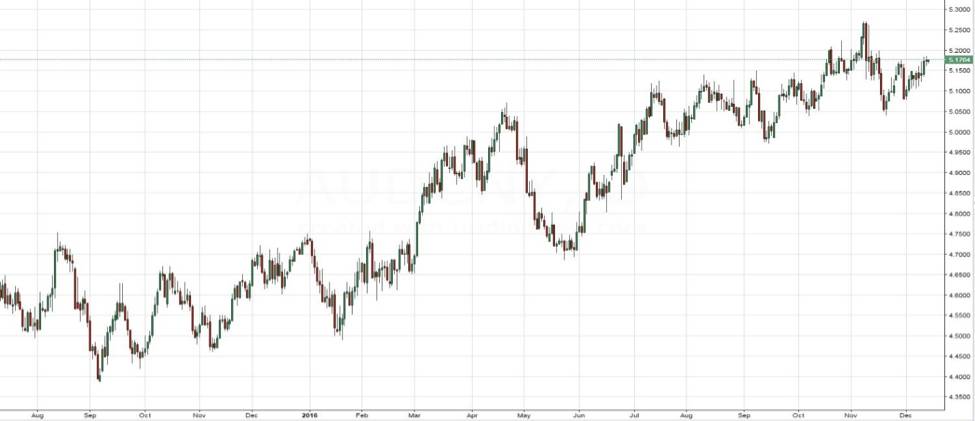 时常关注澳元兑人民币走势的投资者会了解到,在到达高点6.7530(2012年8月6日)之后澳元兑人民币经历了长达几年的下跌过程,于2015年9月4号抵达4.3899的低点之后开启了反弹之路。在稀万国际12月7日的撰文后,澳元兑换人民币于11月8号最高攀升至5.2710;之后经历了大幅回落,本周二(12月13号)最低为5.1616。截至发稿,澳元兑换人民币为5.1773。近期走势图请参考下图: