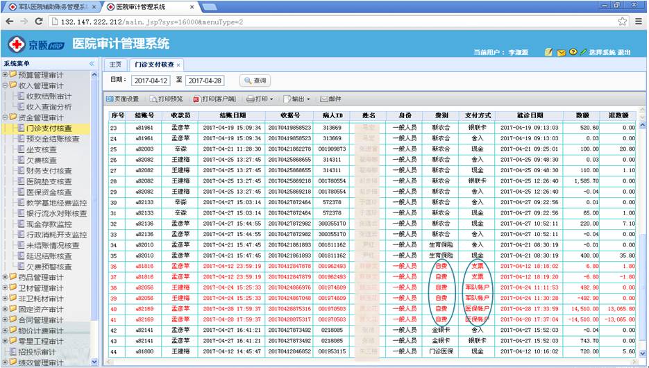 我院正在研发的审计信息系统,。尤其对稽核工作量大、最易疏忽出错的门诊费别与支付方式核查模块已前期上线完成。将在用的所有支付方式和费别进行严格配比,分别从HIS收费系统、财经平台和医保网中提取相关数据,利用数字化的审计方式,对收费室每天几千条数据进行统计、分析、对比,迅速准确将有疑点的结算方式在图表中以红字显示,使原来的事后普遍核查转变为现在的重点实时监控,不仅节省了人力物力,同时也规范了工作流程,提高的工作质量和效率,保证了医疗收入资金安全高效运行, 取得了良好效果(见图3)。