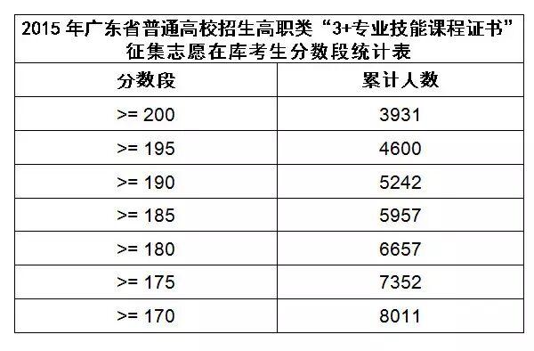 2.2015年广东省普通高校招生第三批专科A类院校征集志愿在库考生分数段统计表